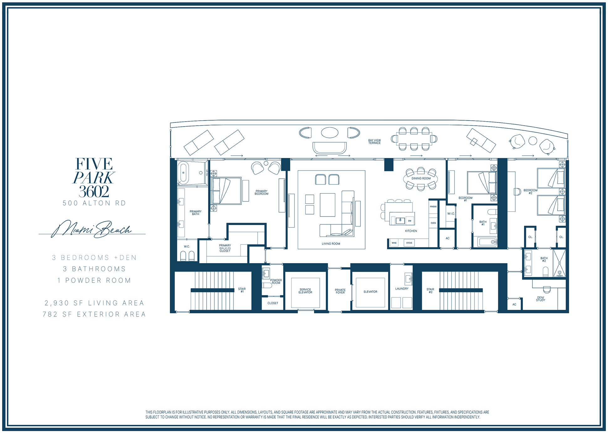 An 800 SF terrace reveals sweeping views of the Miami skyline and Biscayne Bay offering breathtaking views day and night.